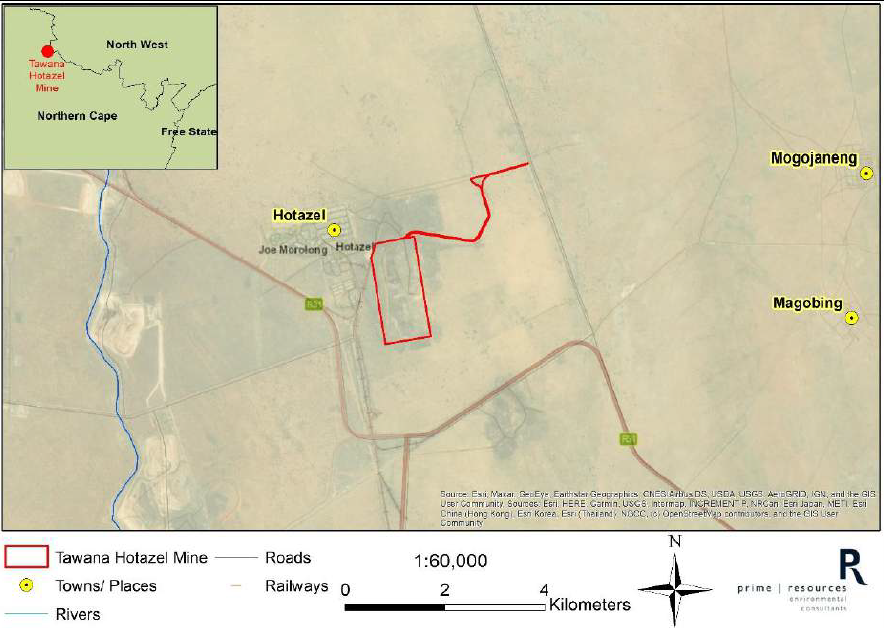The Tawana Hotazel Mine is located about 80 km Northwest of Kuruman, and approximately 1 km south-east of the town of Hotazel, in the South African Kalahari Basin.